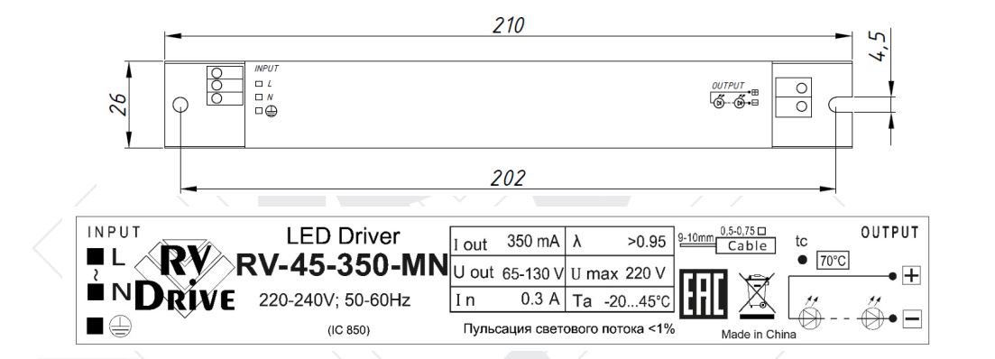 Источник питания LED (драйвер постоянного тока) RV-Drive RV-45-350-MN без гальванической развязки, предназначен для установки в светильник