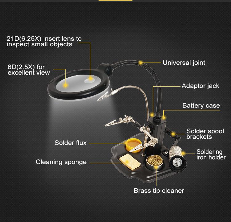 Pro'sKit SN-396 – универсальный набор, включающий держатель для плат, увеличительное стекло со светодиодной подсветкой, держатель для паяльника, губку для очистки жал, медный очиститель жал, паяльный флюс. Подходит для работы с малыми платами, компонентами, для пайки и многих других работ
