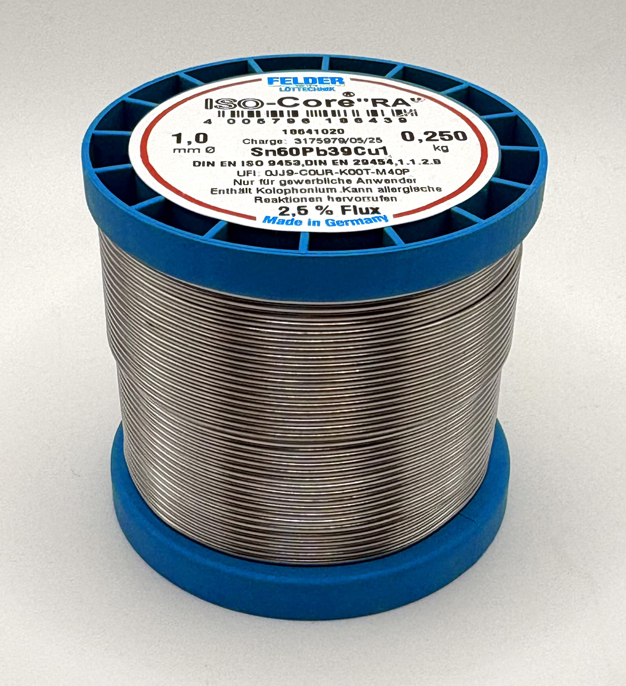Припой 18641020 компании Felder с активированным флюсом на основе модифицированной канифоли ROM1. Предпочтительна отмывка остатков флюса для гарантированного предотвращения коррозии. Расходный материал необходимый для качественной пайки