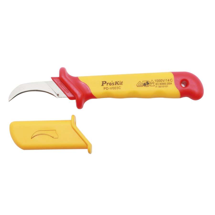 Изолированный кабельный нож с серповидным лезвием PD-V003C для резки и зачистки кабеля, снятия изоляции, можно работать под напряжением до 1000 В, с эргономичной нескользящей рукояткой и защитным колпачком