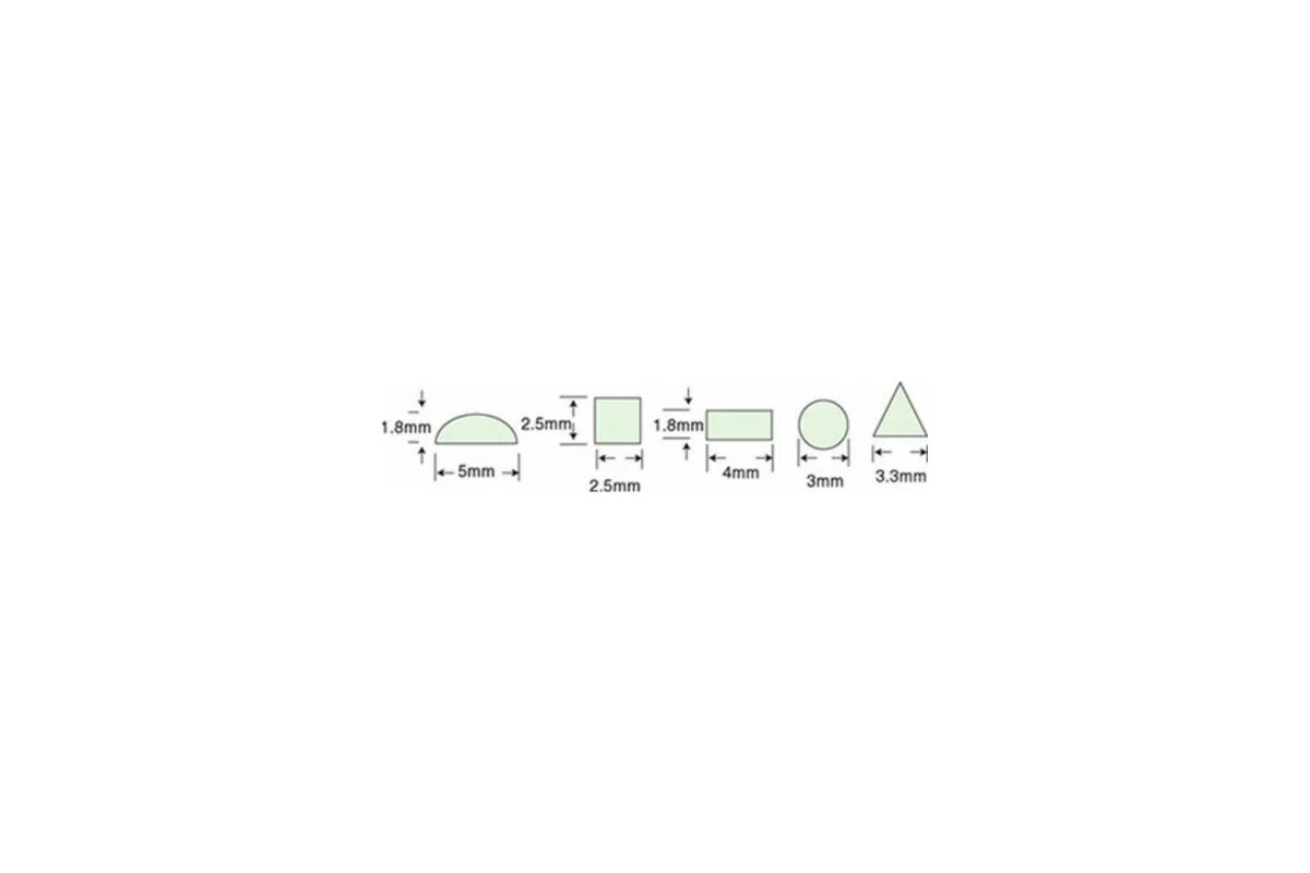 • Состав: треугольный с гранью 3.3 мм, круглый диаметром 3 мм, прямоугольный 4 x 1.8 мм, квадратный 2.5 x 2.5 мм, полукруглый 5 x 1.8 мм