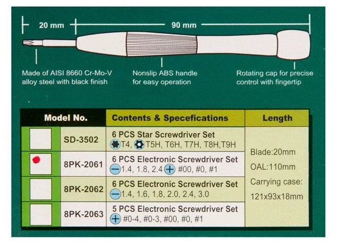Набор прецизионных отверток ProsKit 8PK-2061 для точных работ с легковращающейся шляпкой, состоит из 3 шлицевых отверток и 3 крестовых.