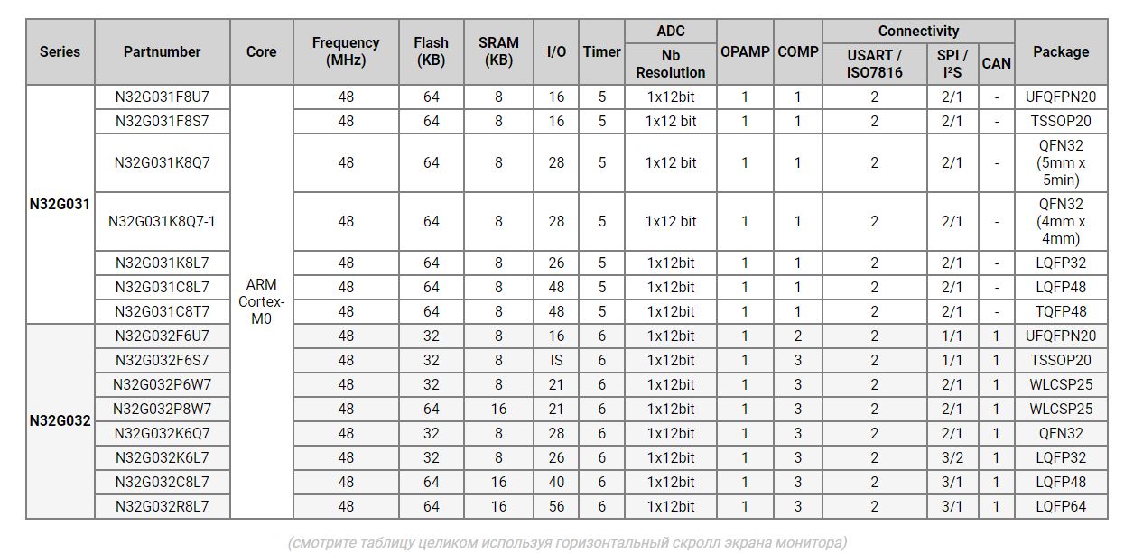 Семейство микроконтроллеров N32G031/032 оснащено ядром ARM Cortex®-M0. Максимальная рабочая частота составляет 48 МГц, содержит до 64 КБ внутренней флэш-памяти и до 16 КБ встроенной SRAM. Поддерживается до 40 переназначаемых вводов/выводов (I/O), а также предоставляется широкий набор аналоговых интерфейсов высокой производительности, включая 12-битный АЦП с максимальной скоростью преобразования 1 Мsps, до 12 внешних входных каналов, 1 независимый операционный усилитель и 1 высокоскоростной компаратор. В то же время предусмотрено несколько цифровых интерфейсов связи, включая 3x U(S)ART, 2x I2C, 2x SPI, 1x интерфейс I2S, 1x CAN.